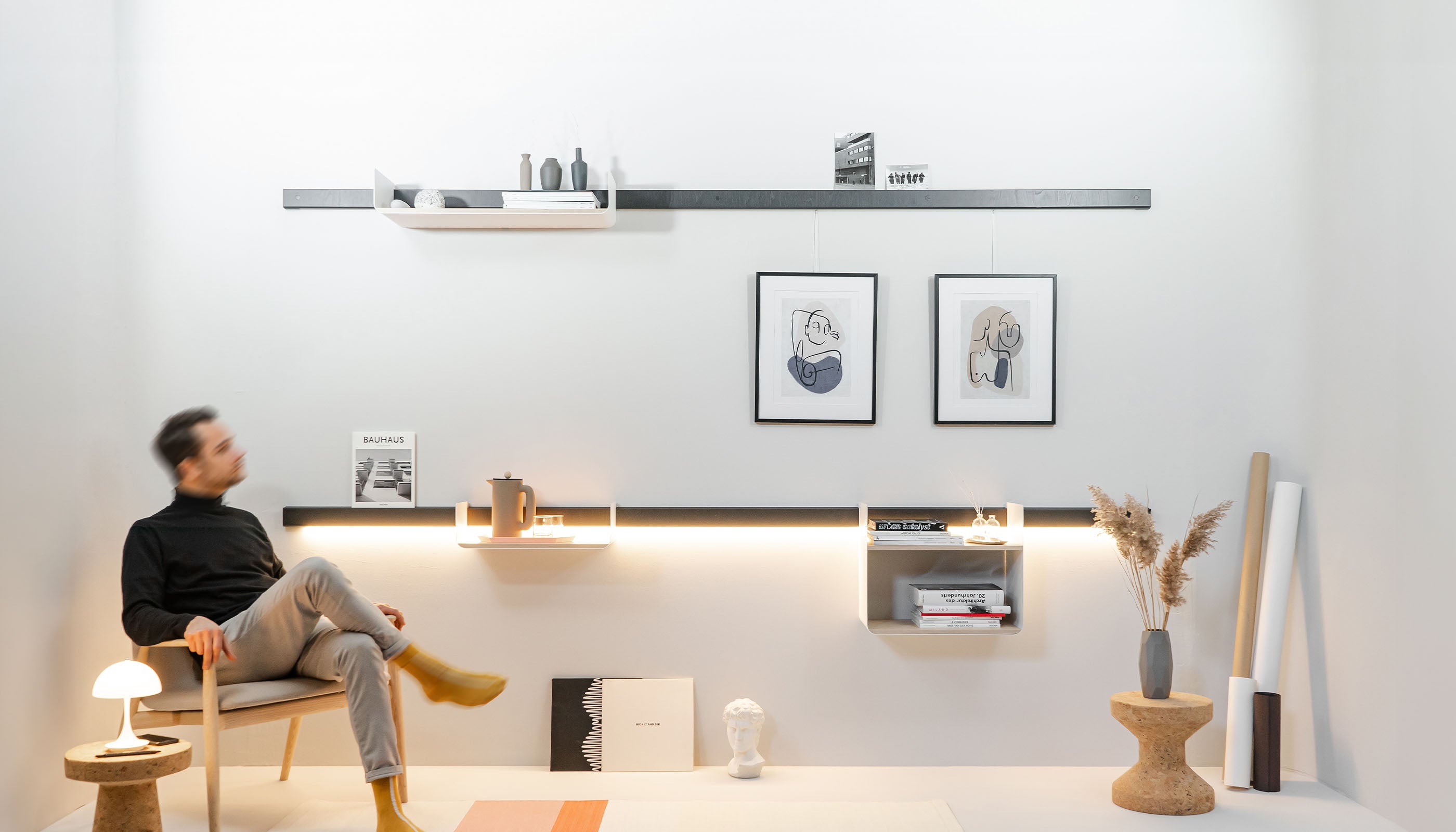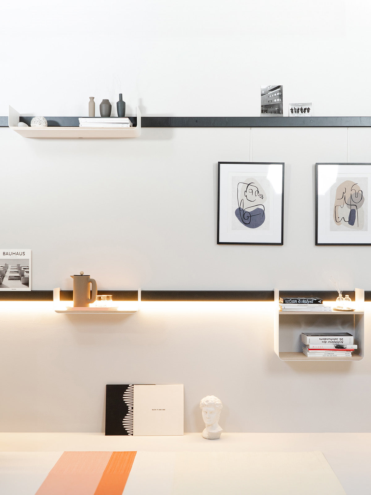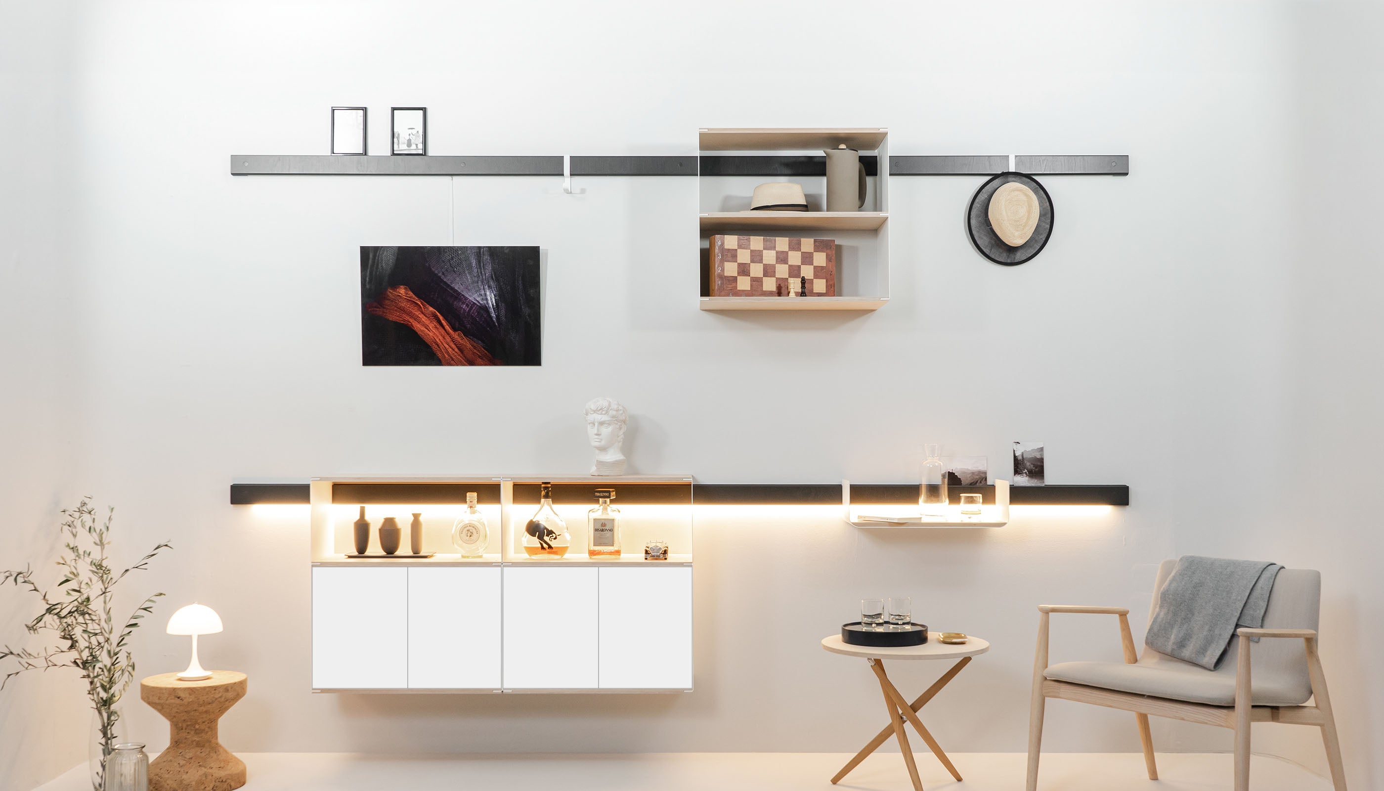 Kreiere deine exklusive Wohnwand im zeitgemäßen Design mit modularen Regalen und stilvollen Wandleisten.