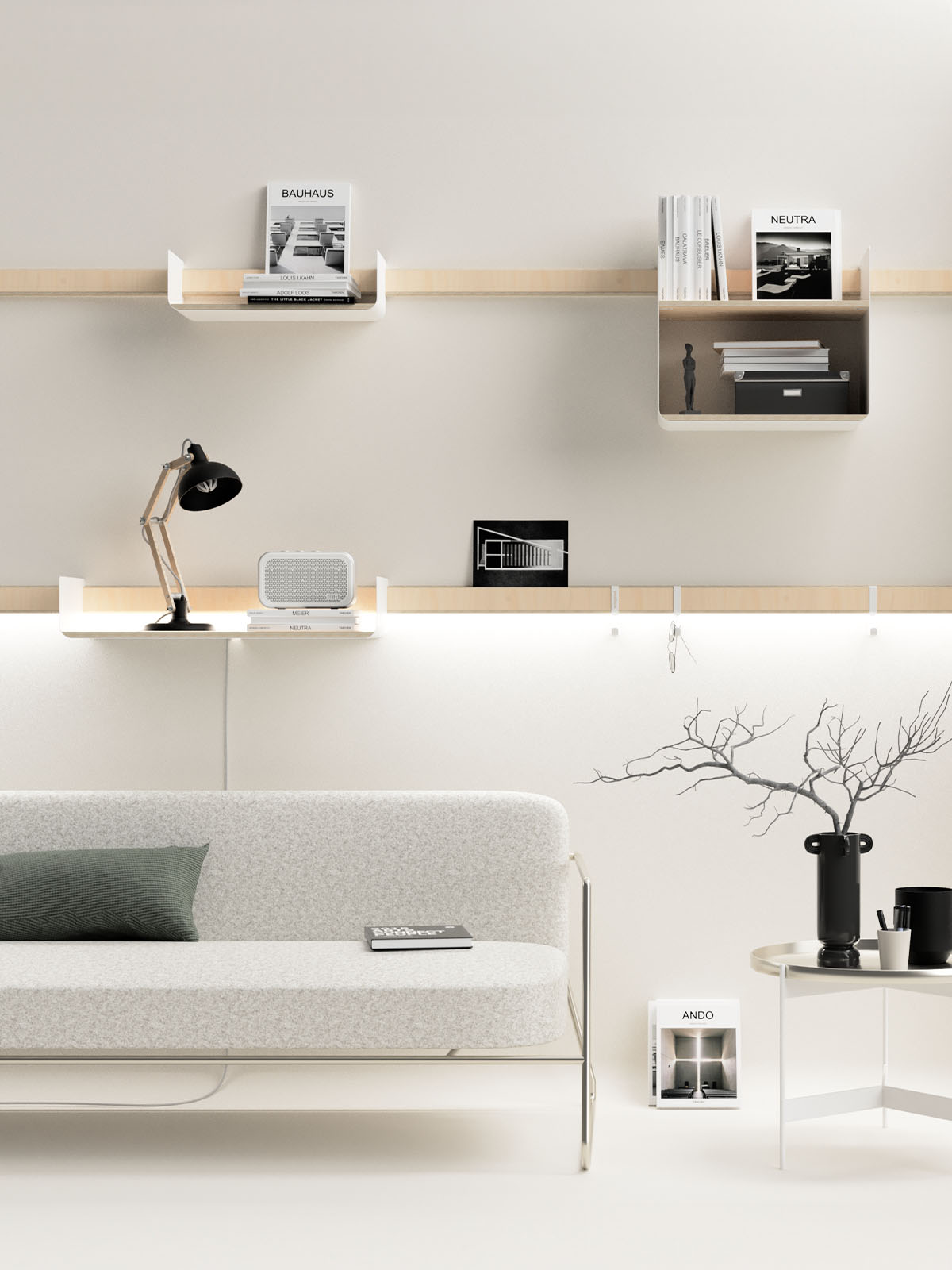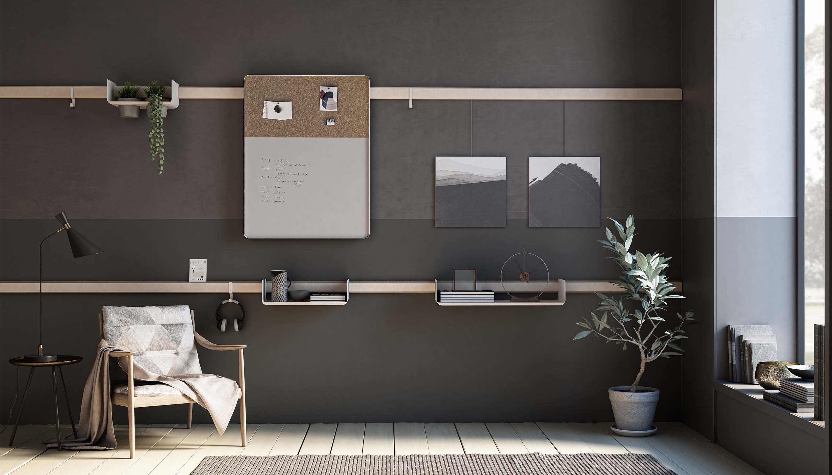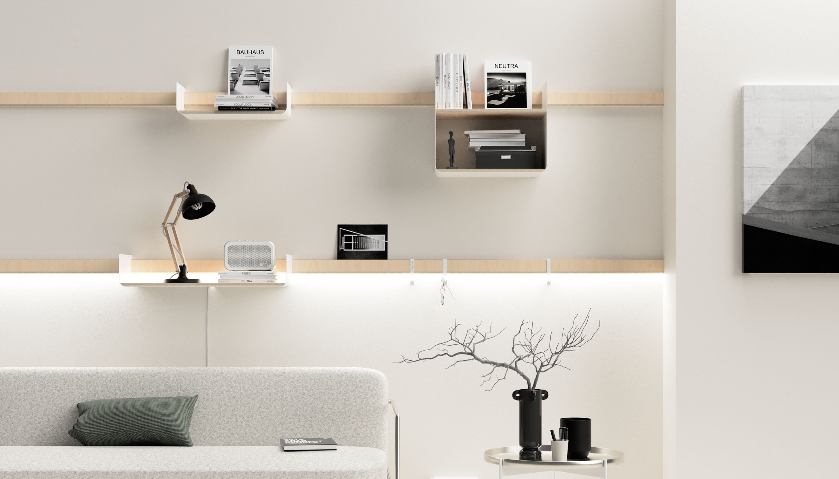 Kreiere deine exklusive Wohnwand im zeitgemäßen Design mit modularen Regalen und stilvollen Wandleisten.