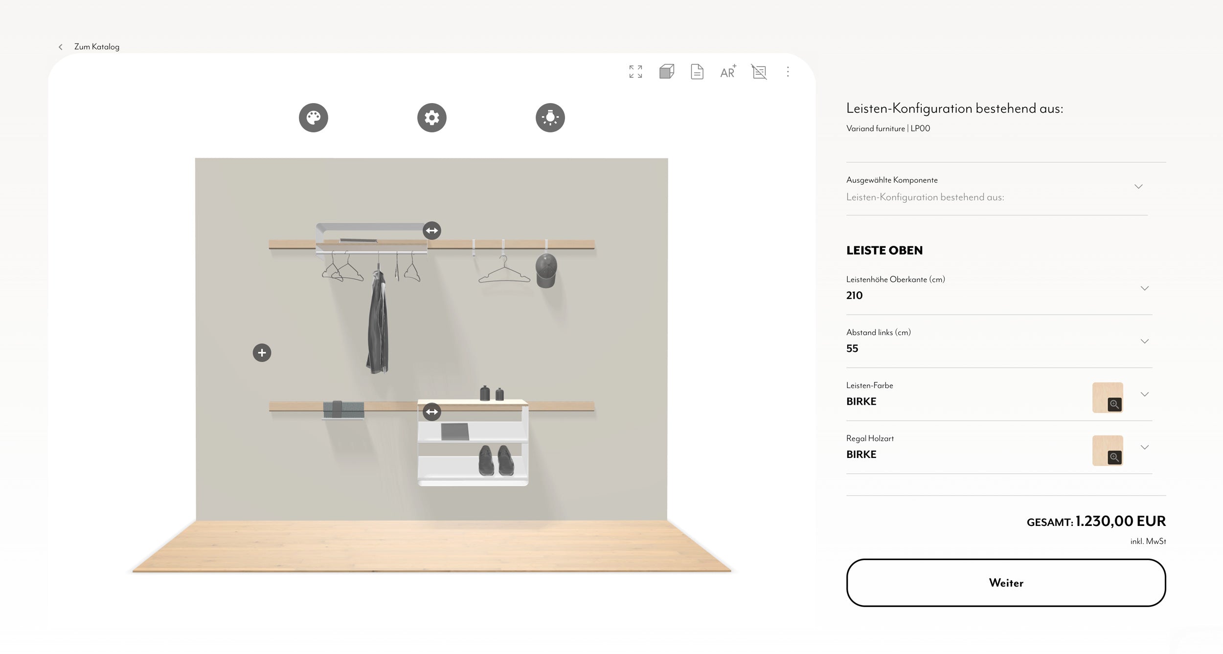 In the right-hand pane, you can scroll through various global and product-specific properties and adjust them. At the very bottom, you'll find the total price and can add the configuration to your shopping cart or save it (when logged in).