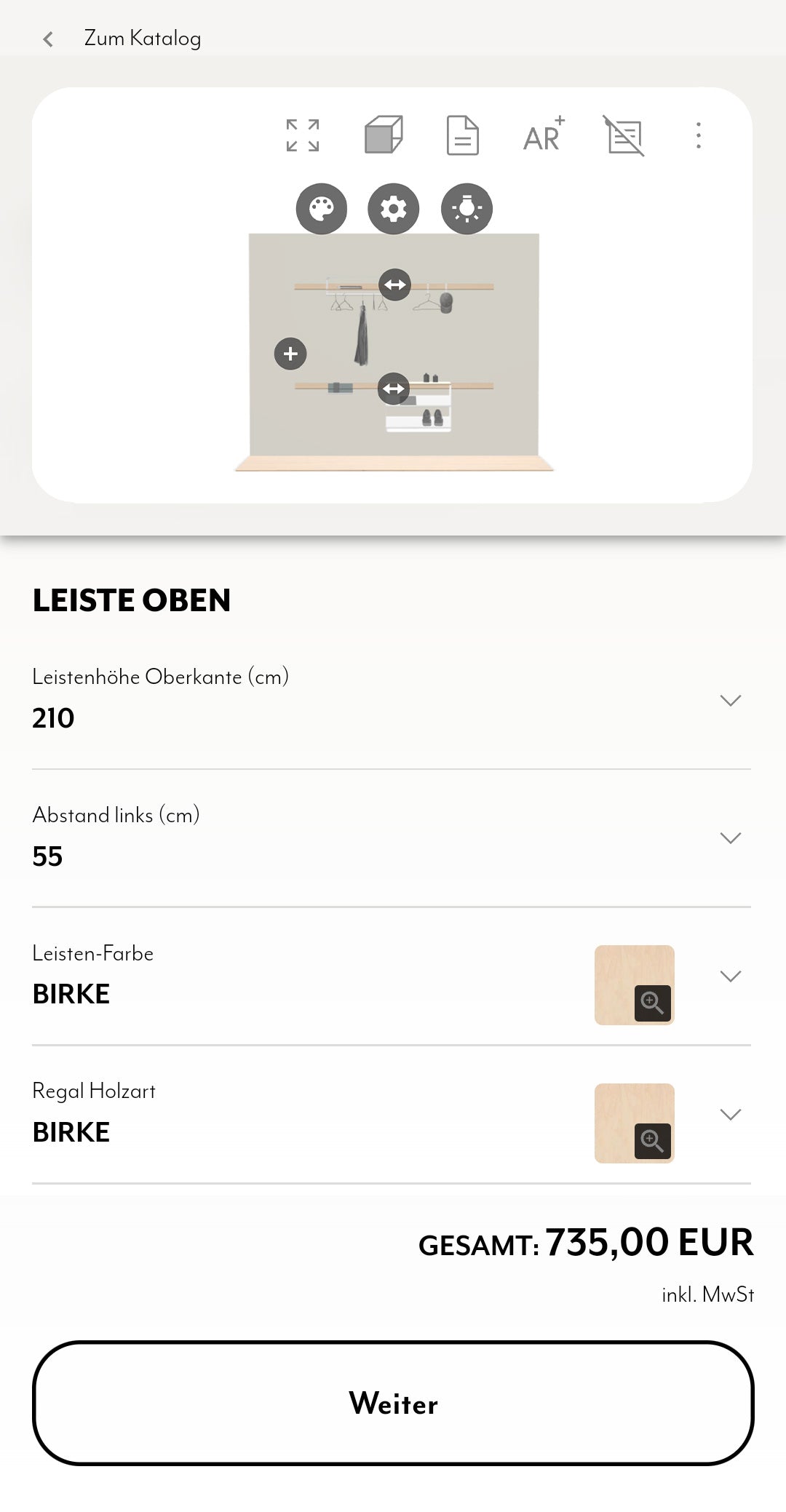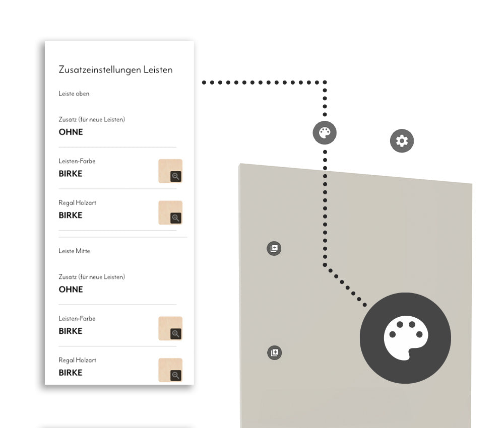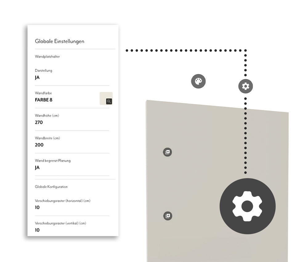 By clicking on the gear you can access various global settings and, for example, adjust the dimensions and color of the wall, the