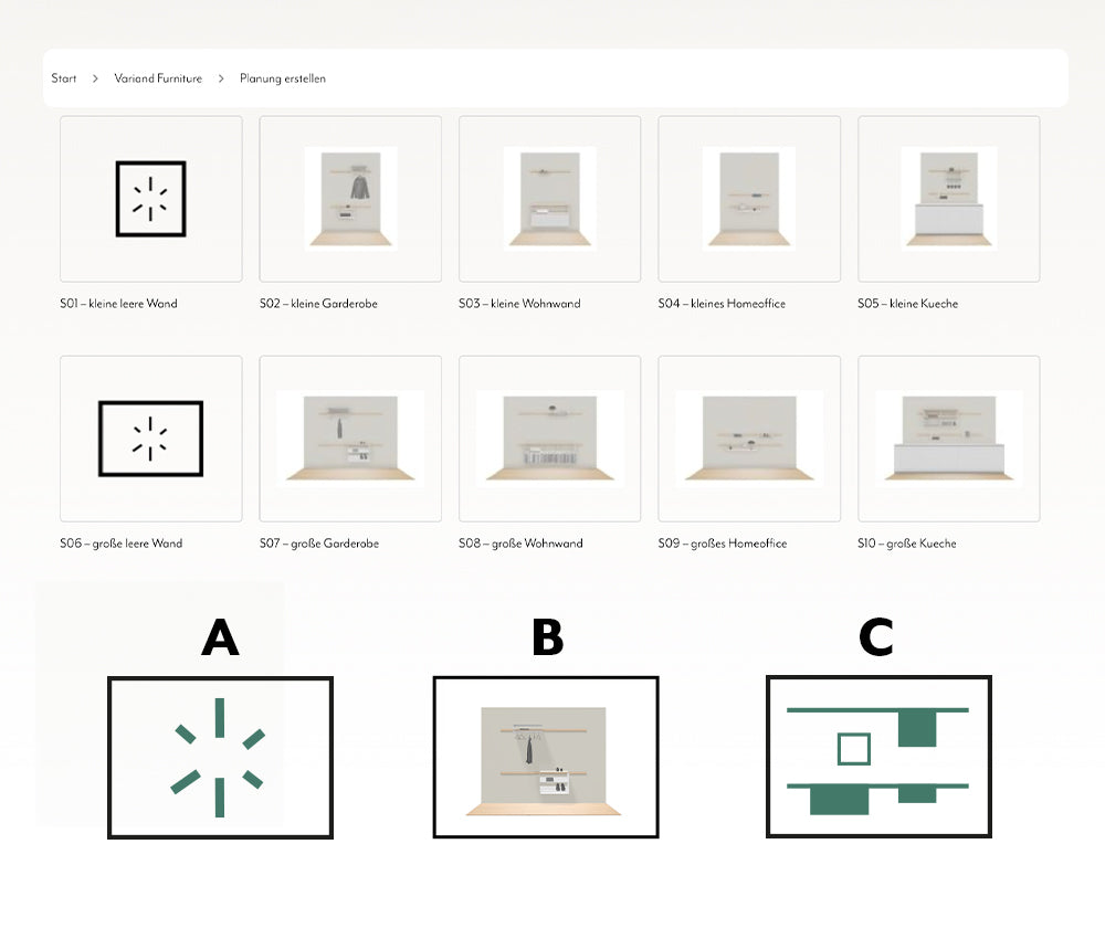C – Get inspiration from fully furnished and decorated sets or use them as a basis for your planning. Please note that some decorative elements will not be saved.