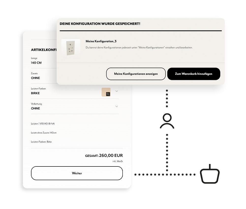 IMPORTANTPlease note that your configuration will only be saved if you have previously created a customer account and are logged in. Without logging in, your configuration will only be added to your shopping cart, but you won't be able to open it again.