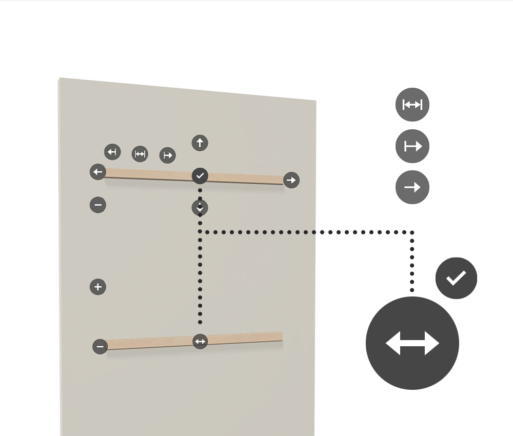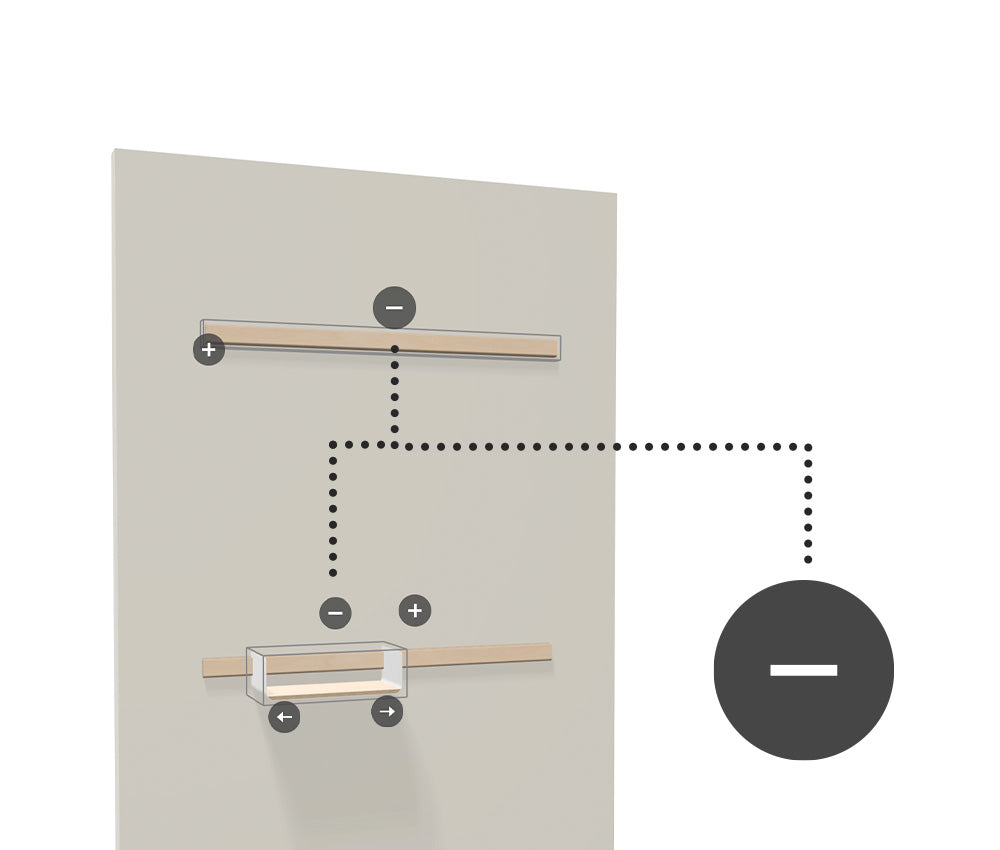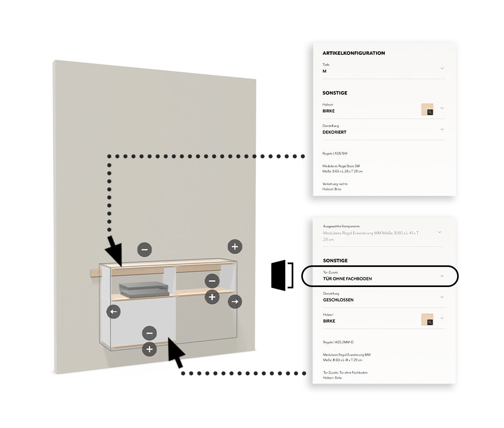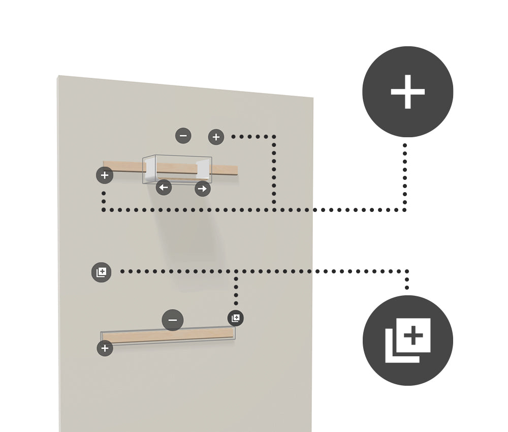 To build a shelf or sideboard with the A05 modular wall shelf, you first need to place a hanging shelf. From the first shelf, you can add additional shelves downwards and to the right above +.