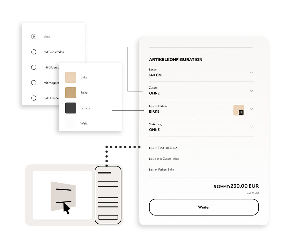 In the lower section, you can scroll through various global and product-specific properties and adjust them. At the very bottom, you'll find the total price and can add the configuration to your shopping cart or save it (when logged in).